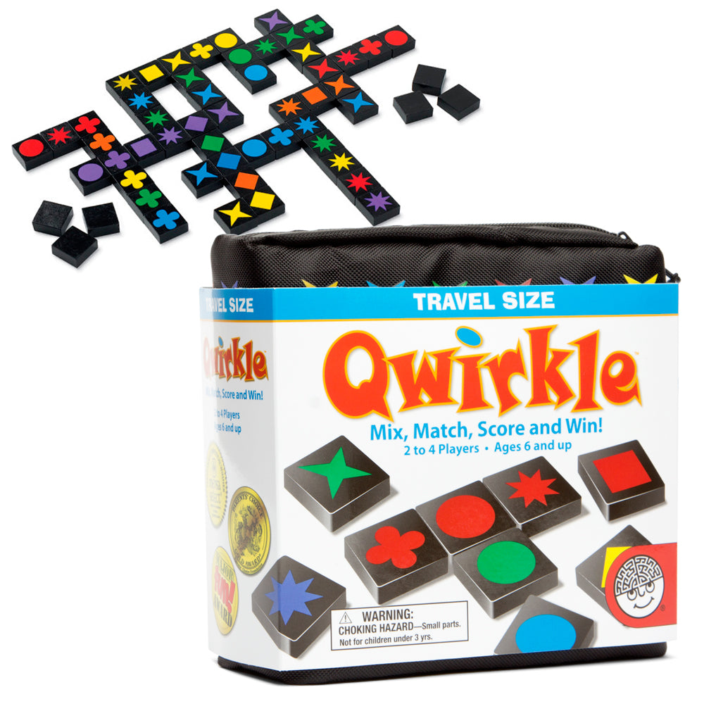 Travel-sized Qwirkle plays just like the award-winning original. It’s as simple as matching colours and shapes, but it takes both logic and strategy to score big. Plan your moves to create columns and rows of matching colours and shapes; score big when you place a tile that works in multiple directions.