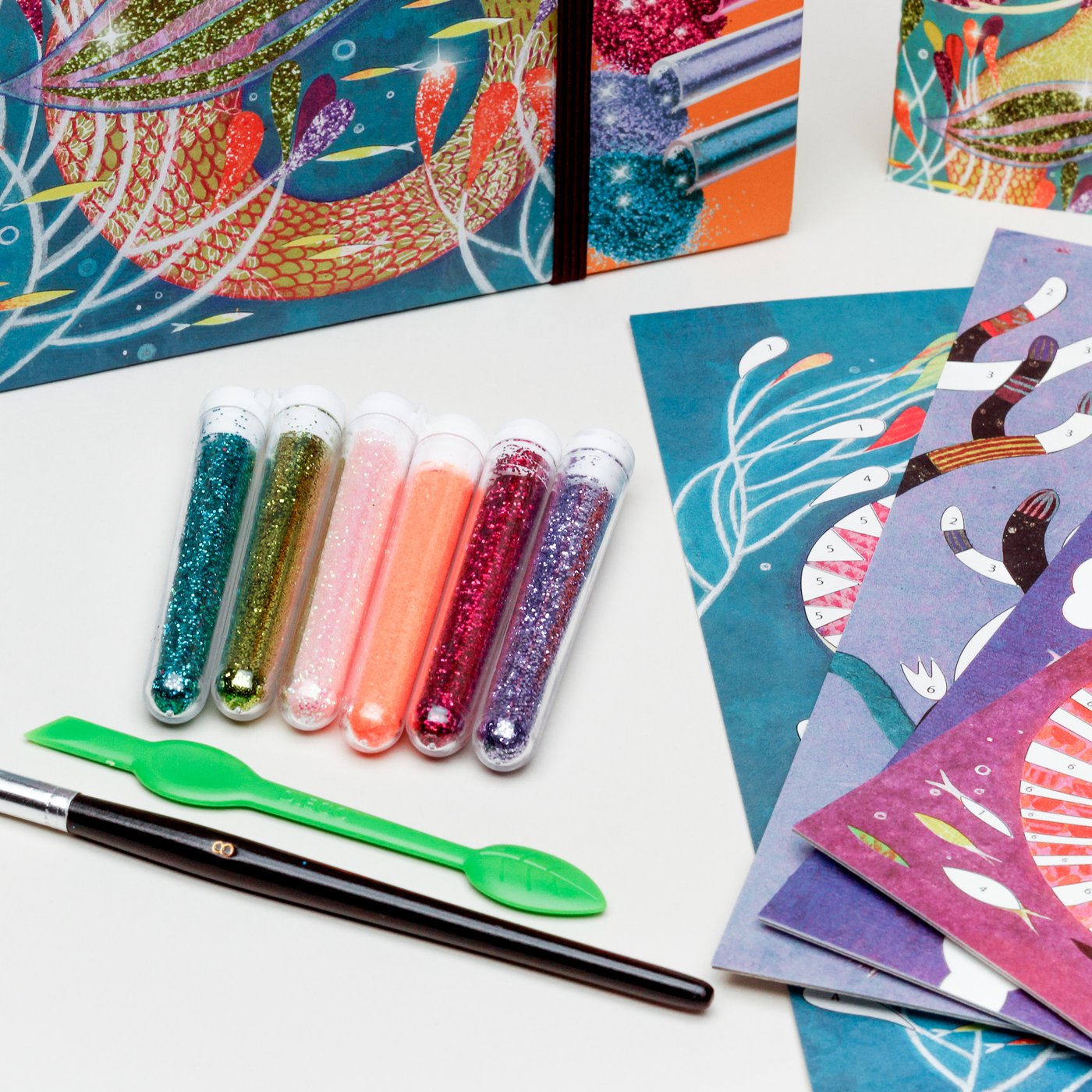 Contents: 4 pre-glued cards (15cm x 21cm), 6 tubes of glitter, a lifting tool, a brush, and a step by step booklet.