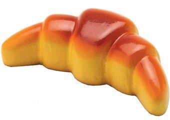 There is a croissant, a pot of jam, a bread roll, milk, orange juice and a bun. Perfect for selling at the market, or for use at a breakfast party. Pass the milk please!