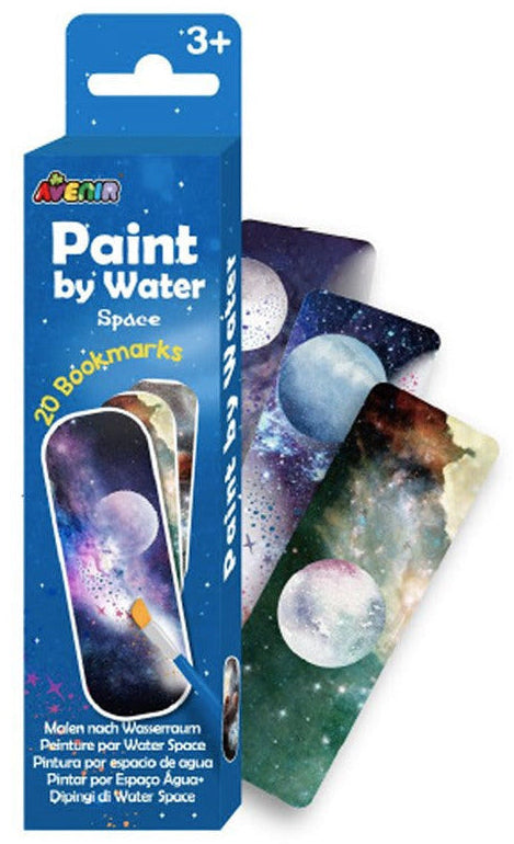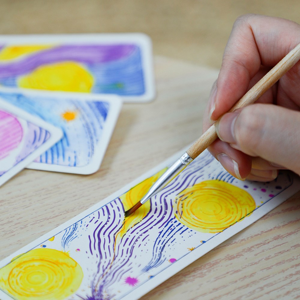 The colours are printed in the bookmarks and are released using a wet paint brush. Paint the bookmark and let the colours spread like magic!
