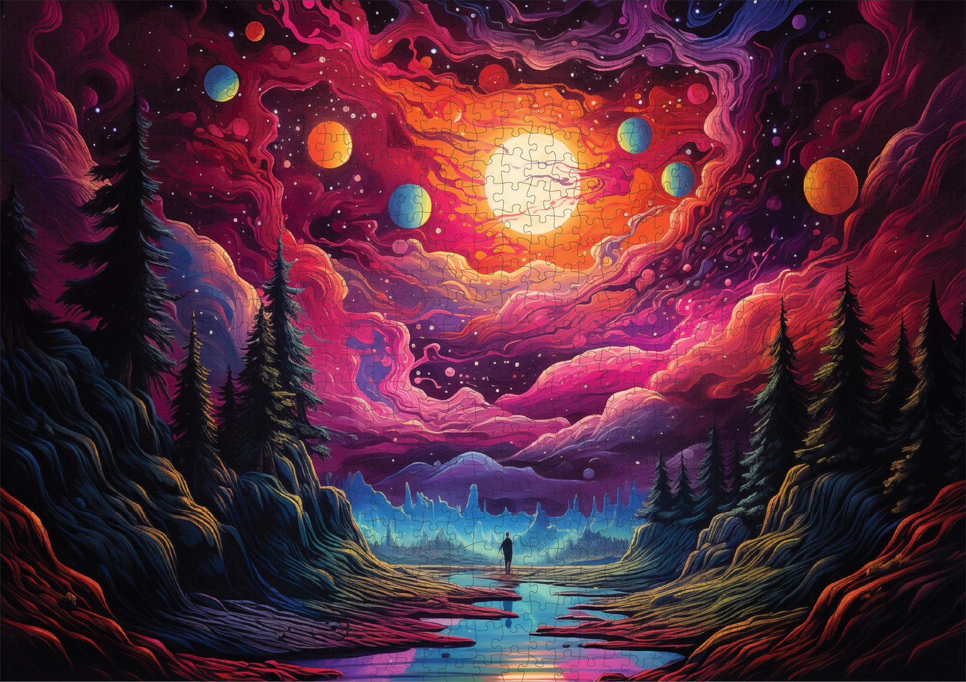 Take an interstellar journey with the Cosmic Canvas 1000-piece jigsaw puzzle. This vibrant design captures the breathtaking beauty of a surreal planetary landscape, complete with orbiting planets and a mesmerizing space sunset illuminating the horizon. Perfect for adults and families, it offers a fun yet rewarding challenge that transports you to another dimension.