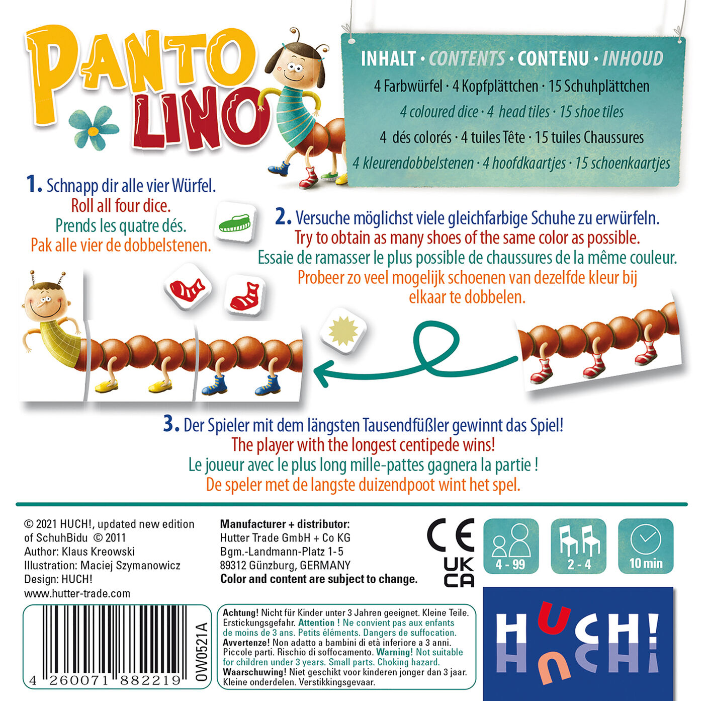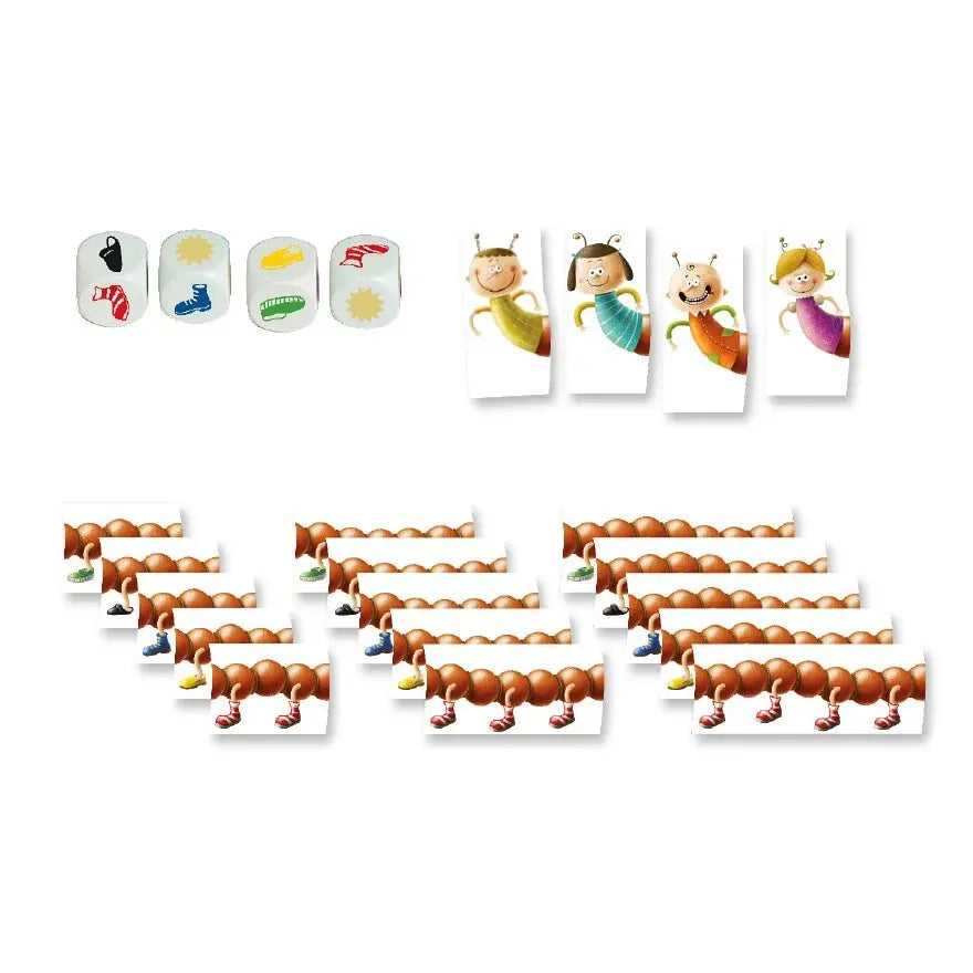 The player who has put together the longest centipede at the end wins the game. Children from the age of 4 learn how to add and subtract! For older players there is a variant in which the player is allowed to steal shoes.