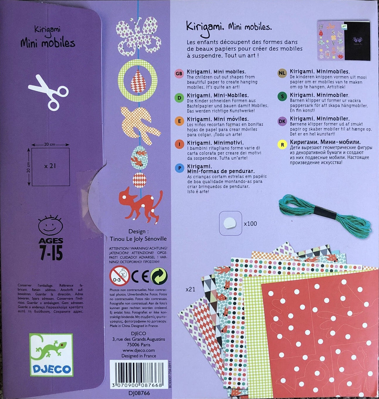 This set includes patterned paper, thread and instructions on how to make mobiles.