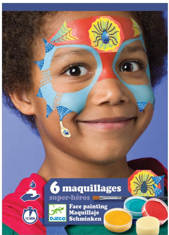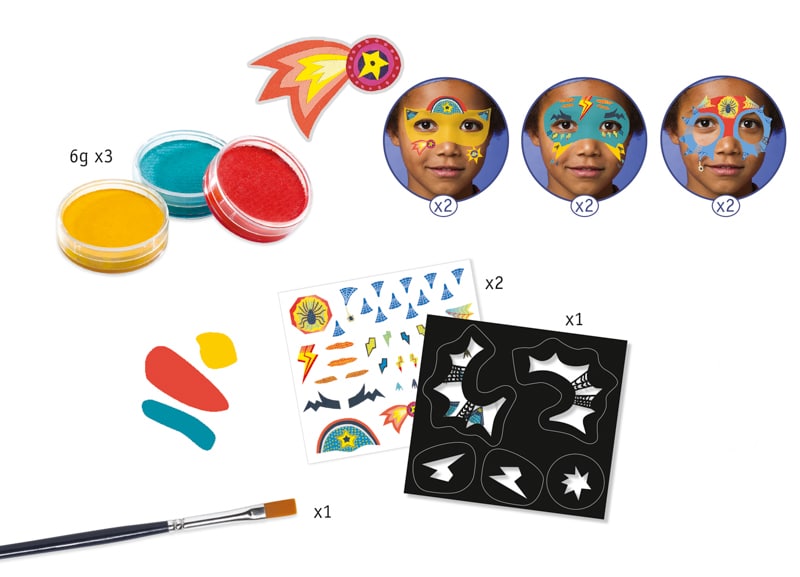 The Djeco Superhero face painting kit includes three different easy designs. The make up applies like paint using a brush or sponge. The set also includes stickers and stencils for final touches, with two sets of each sticker set included.