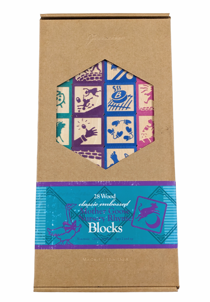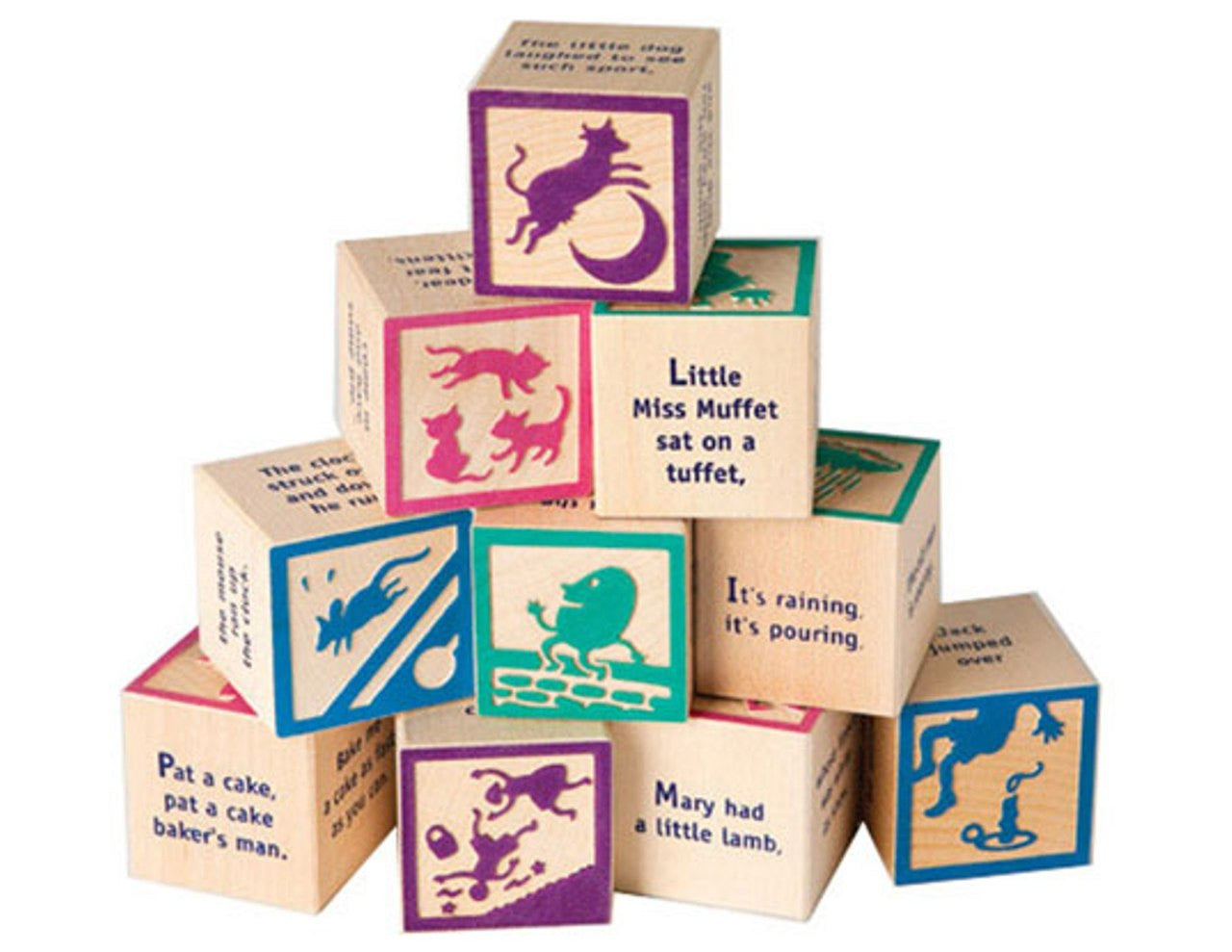 Hickory, dickory, block. This 28 block Nursery Rhyme set is attractive, educational and fun, and makes a great baby shower or birthday gift. Each block is embossed with two silhouette images from Mother Goose stories, with the nursery rhyme text on the other four sides. Mother Goose isn't our only muse, however.