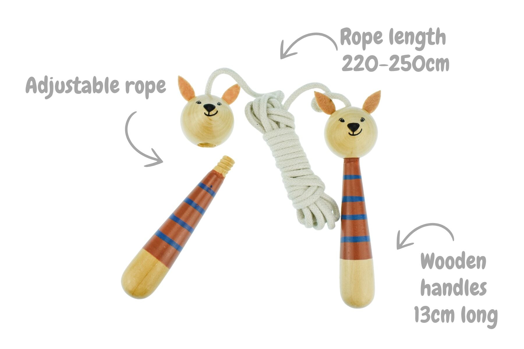 Hop, skip and jump into a world of fun. The Wooden Adjustable Skipping Rope features a cute kangaroo handle and adjustable length. Perfect for kids to enjoy active play and develop coordination.