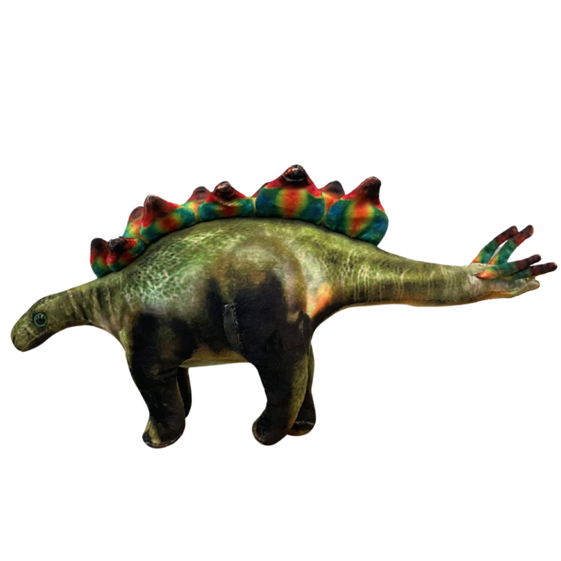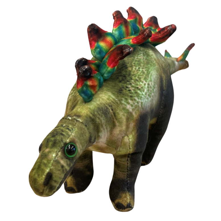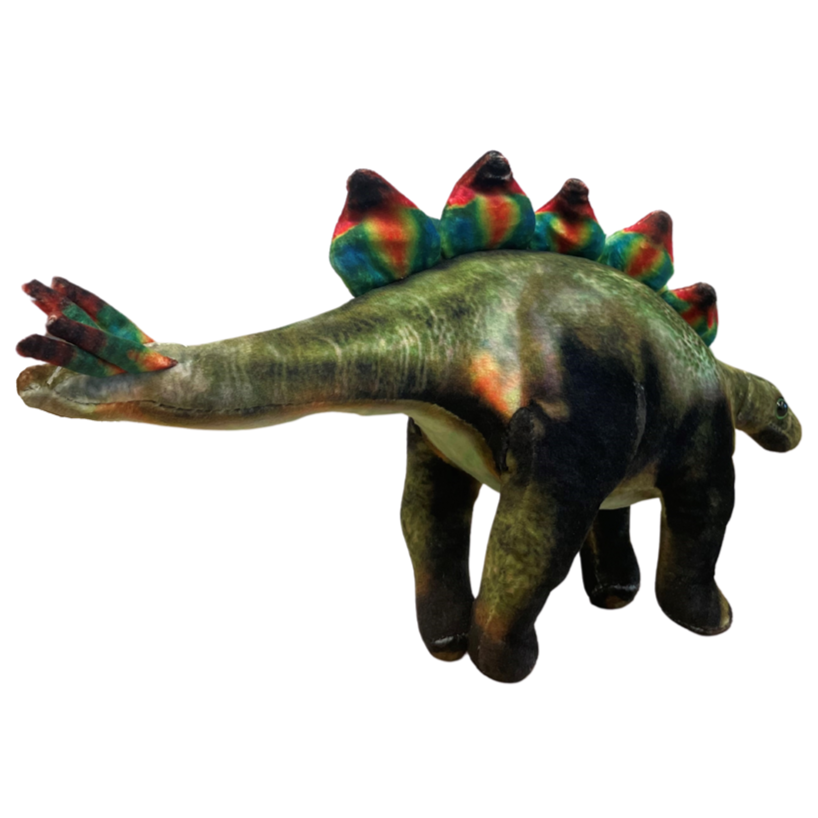 This cool plush dinosaur captures the essence of the Stegosaurus with its distinctive row of kite-shaped plates rising dramatically down its back and its spiked tail, all rendered in child-friendly, vibrant colors.
